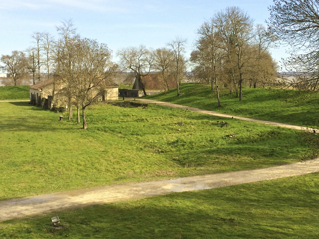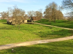 The powder house—behind the wall with the tall roof—was a later addition. The building obscured by trees contains the chapel, barroom and primitive hospital.