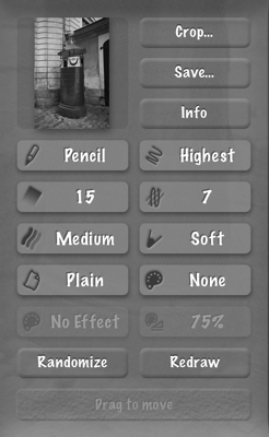 Click on a button to adjust settings. Crop and Save are obvious. Other choices affect technique (pencil/chalk, coloured/not), detail, number of shades, number of overlapped strokes, intensity of shading, tip (levels of hard to soft), paper, paper colour, colour effect and strength of effect.